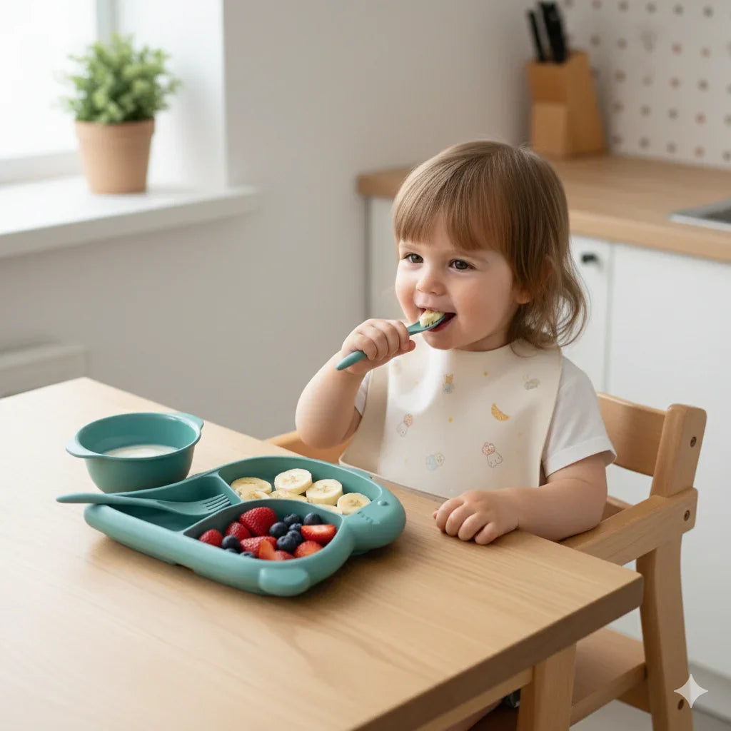O prato possui divisórias que ajudam a separar os alimentos, facilitando o método BLW (Baby-Led Weaning). Os talheres são ergonômicos e perfeitos para as mãozinhas pequenas.